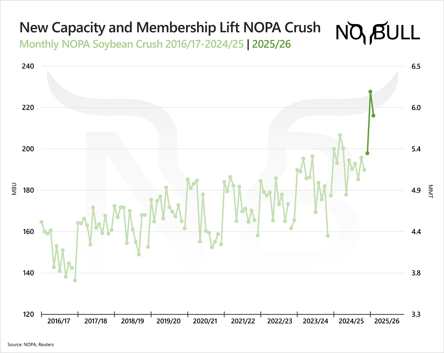 Added crush capacity and expanded membership unsurprisingly pushed November NOPA crush to another monthly record. At 216 mbu (5.9 mmt), November crush blew past the prior November record, though it fell 5% from October — the largest Oct-to-Nov percentage decline since 2019.