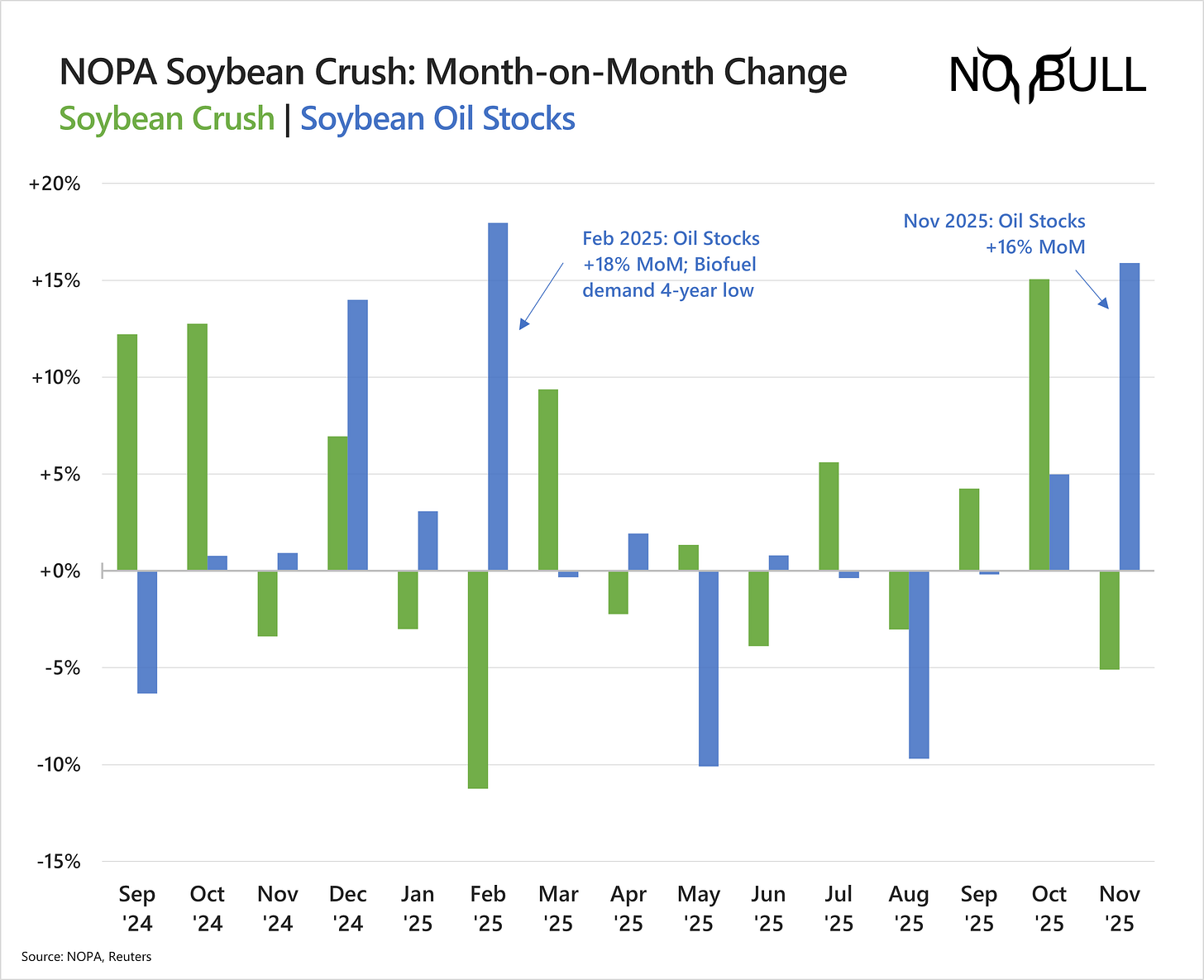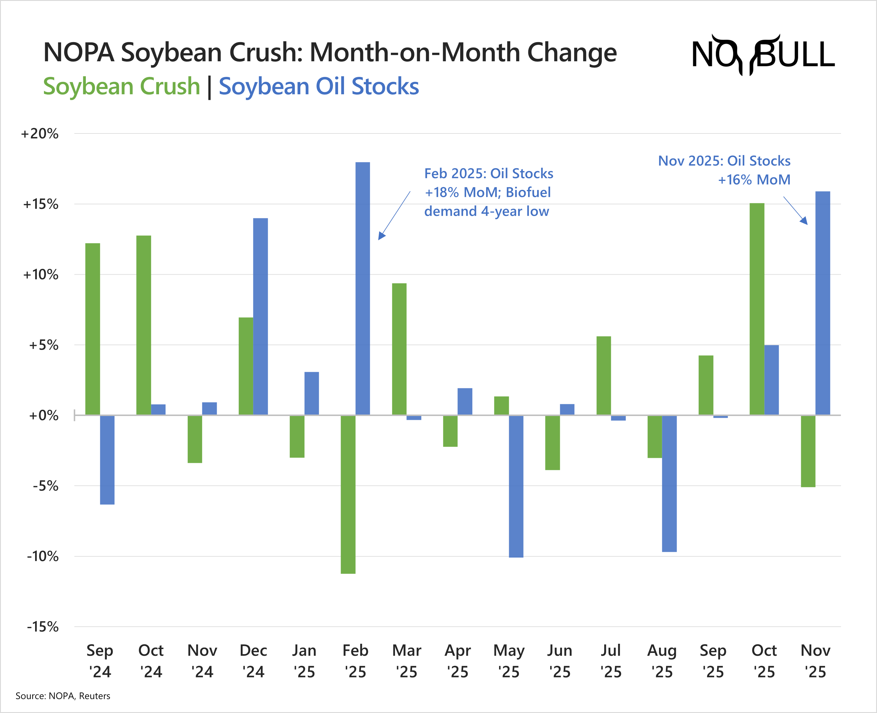 While oil stocks typically build into winter as demand slows, this increase stands out as the largest monthly build since February 2025 — the same month soybean oil biofuel demand hit a four-year low following the initial 45Z fallout.